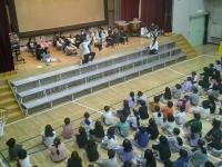 写真は3年3組の給食風景。「ご飯、おいしい」の声が聞こえ、おかわりに並ぶ子どもたちがいました。