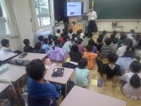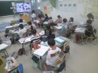 3年生が国語の書写、毛筆で練習していたのは「日」という文字。縦と横の線ですが、折れがあります。文字のバランス、書くときのポイントなどを確認して半紙に向かっていました。