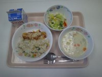 献立は、きのこピラフ、タラのピザ風焼き、イタリアンサラダ、さつまいものクリームス...
