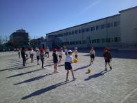 2年生の校庭での体育はボールを使った運動。友だちとキャッチボール。だんだん間の距...