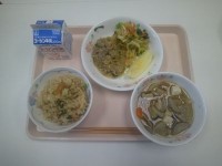 献立は、わかめご飯、擬製豆腐、ひじきの煮物、さつまいもの味噌汁、夢オレンジ、牛乳...