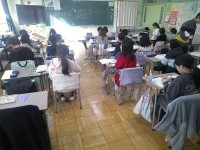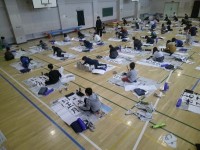 3年生が体育館で書初めの練習をしていました。だるま筆を使うのが初めてという子も多...