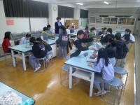 5年生の図工は「ねんど像祭」。グループごとの机の真ん中に大きな粘土のかたまりが用...