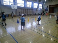 6年生の体育館での体育。ネットの代わりにコーンとバーでコートを区切り、ボールをバ...