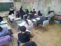 6年生の英語の学習。まとめのペーパーテストに取り組んでいました。英語を聴きとり、...