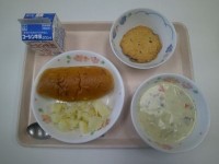 献立は、パインパン、こふき芋、鮭のクリームチャウダー、がまくんのチョコチップクッ...