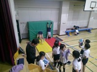 マット運動に取り組んでいる3年生の体育。タブレット端末も使いながら、うまくできる...