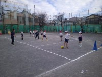2年生の校庭での体育。赤白のチームに分かれてボールを蹴って点を取り合うゲームをし...