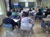 5年生の外国語。英語での街の紹介から、その内容を聴き取ろうという学習です。誰がい...