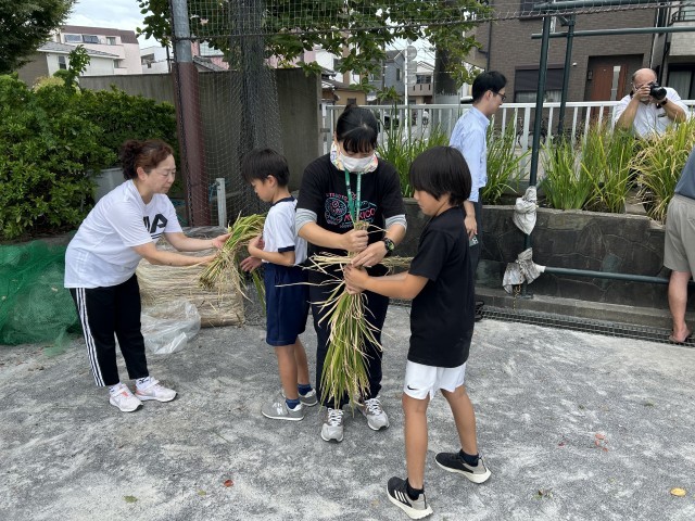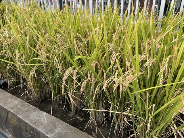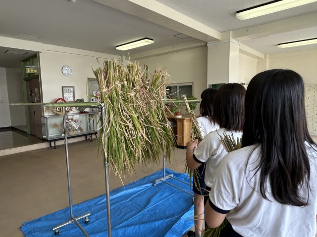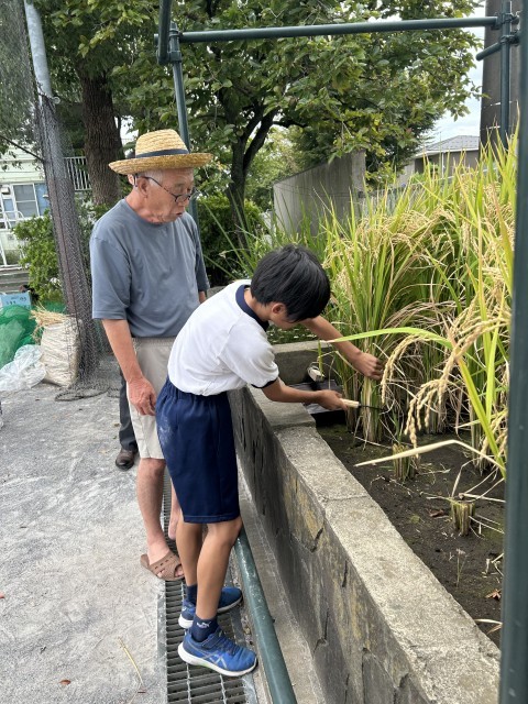 29日に5年生はグリーンボランティアの皆さんに助けていただきながら稲刈りをしました。たわわに実った稲を一人ずつかまで刈り、束にして竿に干しました。これから乾燥させて、脱穀まで楽しみに待ちます。