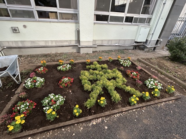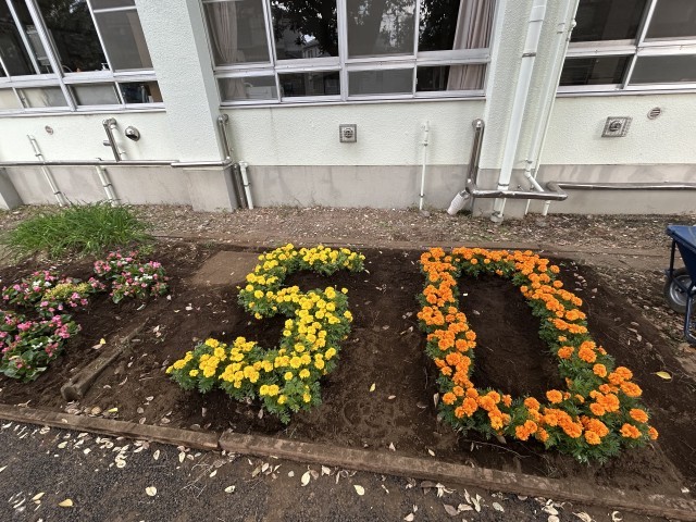 校舎南の花壇にも花の寄せ植えで、東と50の文字が。