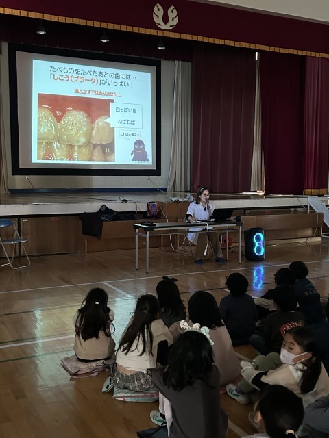 3年生は学校歯科医の先生から、虫歯予防についての授業をしていただきました。自分の歯と健康は自分で守っていくことを教えていただきました。