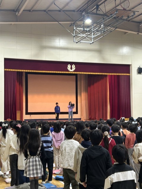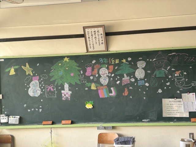 クリスマスの今日、2学期の終業式でした。教室の黒板には楽しそうなクリスマスの飾り付けなども見られました。児童の代表の言葉は2年生。とても立派にできました。