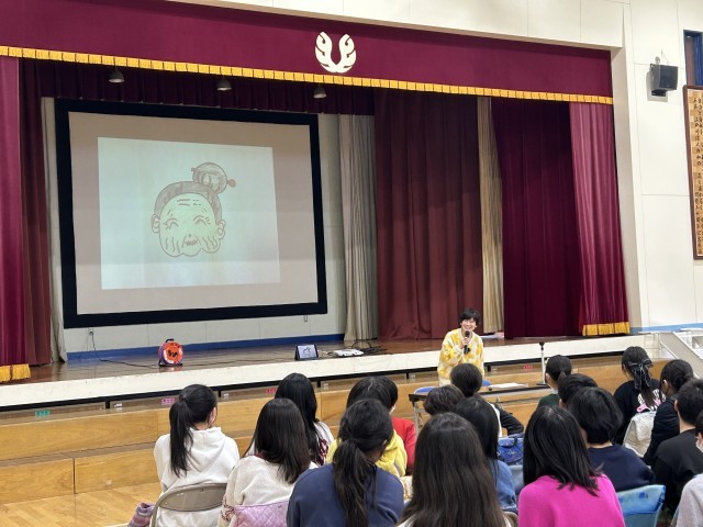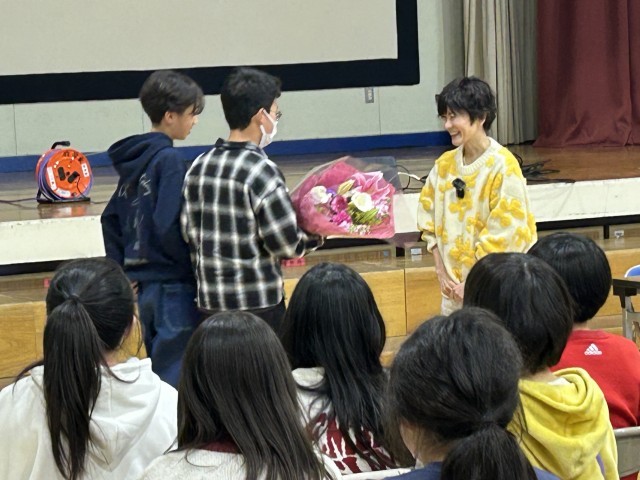 6年生は、「声のつばさ」の声優によるキャリア教育の体験授業を受けました。なんと学校にやってきたのは、クレヨンしんちゃんの声で有名な、小林由美子さん。オープニングはしんちゃんの声で登場!