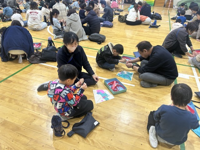 1年生は江戸川凧の愛好会会長、蒲倉さんをお招きして、親子で凧作りを行いました。自分で絵を描きた和紙に骨をしっかり付けたら糸を結びます。