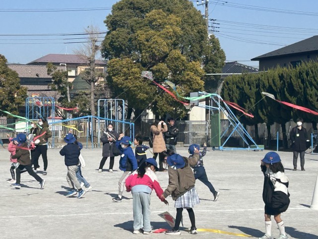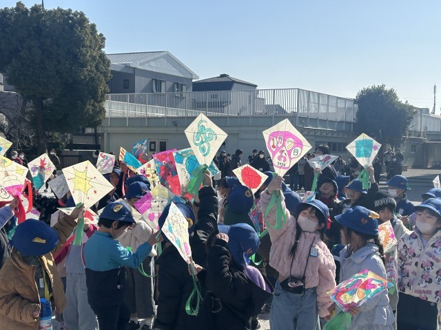 完成した世界に1つの自分の凧を持って外に出ました。お天気もよく、凧あげをみんなで楽しみました。お手伝いしてくださった保護者の皆さん、ありがとうございました。