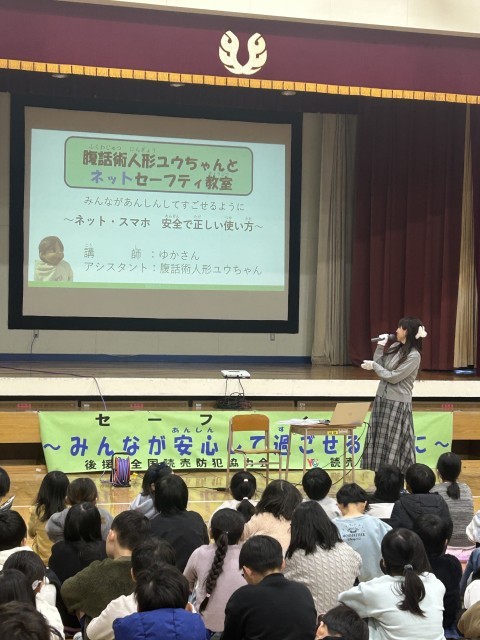 3.4年生は腹話術人形のゆうちゃんと一緒に、インターネットや携帯の安全で正しい使い方について学びました。知らない人に個人情報を教えることの恐ろしさや、個人情報をインターネットにあげる危険性について教えて頂きました。軽い気持ちで、人の悪口や個人情報などをインターネットにあげることも取り返しのつかないことになって犯罪に巻き込まれることもあります。ご家族でもよくお話をしていただき、子供たちの安全や未来を大事にしていけたらと思います。
