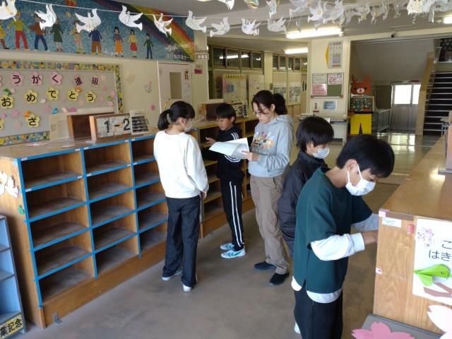 新1年生を温かく迎えるために、6年生が廊下の飾り付けや靴箱表示にも丁寧に取り組んでいます。1年生が笑顔で入学してくるのが楽しみです。