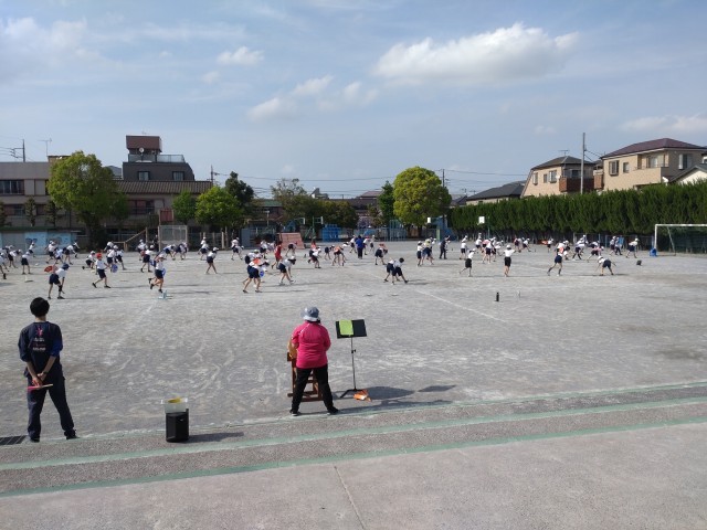 校庭に太鼓の音が響き渡り、御神楽の練習が始まりました。錫杖と扇子を手に、1つ1つの動きを覚えていきます。6年生と5年生がグループになって、丁寧に教えています。