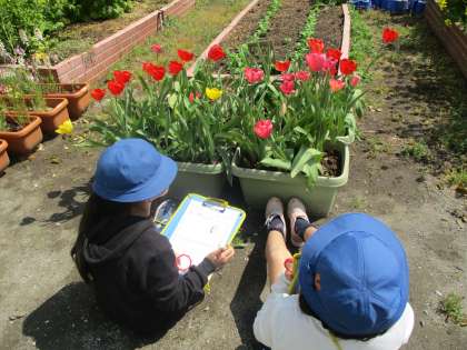 また、それぞれに違いがあることにも気付きました。花の名前を、図鑑を使って調べる姿も見られました。