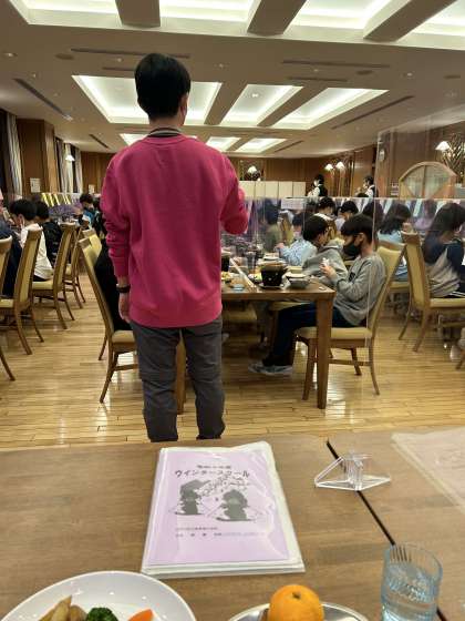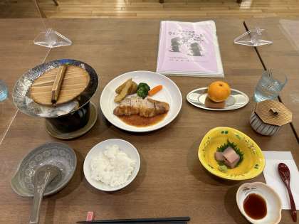 ちょっと時間をさかのぼって、最後の夕食の風景。ご馳走でした。食事係さんお疲れ様でした。