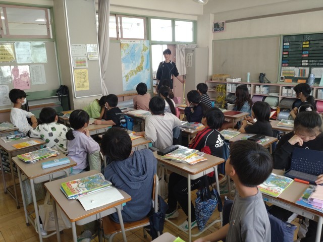 5年生の教室では、日本地図を使った話し合い、漢字練習の仕方、社会科の授業開き等、高学年の学習がスタートしました。話を聞く態度が、さすが5年生です。