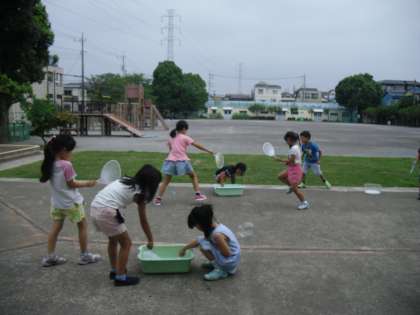 教師が手作りしたシャボン玉液に、持ってきた道具をつけ、上手に大きなシャボン玉を作っていました。うちわを使うとさまざまな形のシャボン玉ができ、盛り上がっていました。
