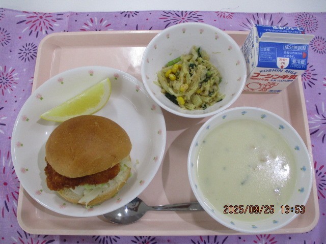 フィッシュバーガーは、白身の魚をフライにして、野菜と一緒にパンにはさんでから、蒸してふわっと作りました。