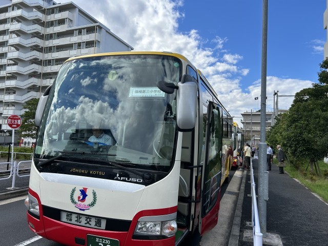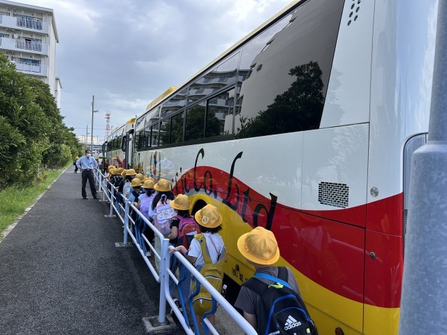雨上がりの空をバックに、2年生が生活科見学に出かけます。
