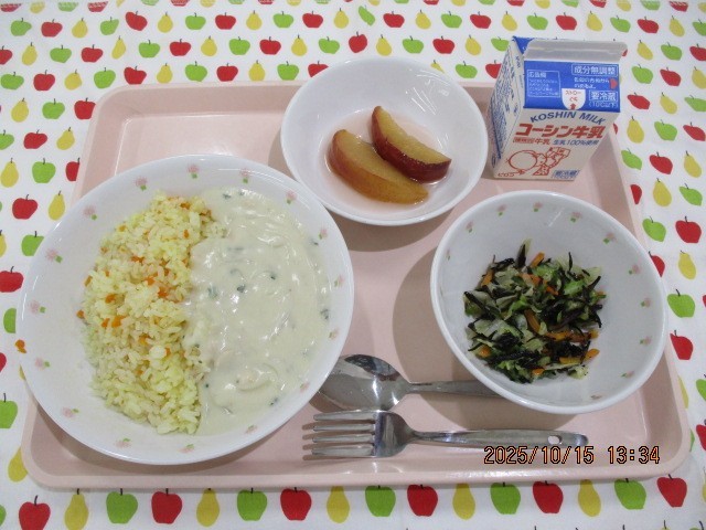 キャロットライスは、にんじんを入れて炊いたピラフです。クリームソースをかけて食べます。にんじんが苦手な人にぜひ食べて欲しい給食です。