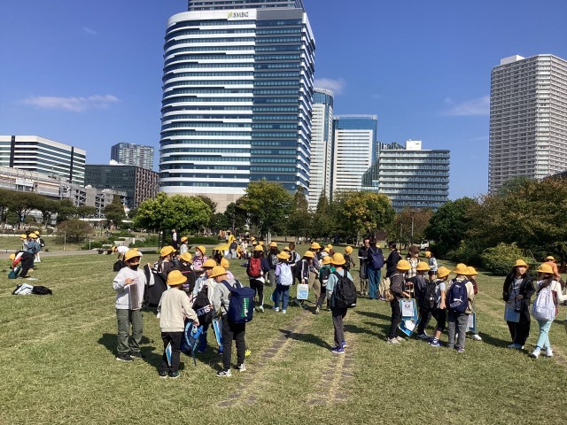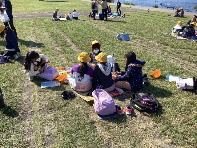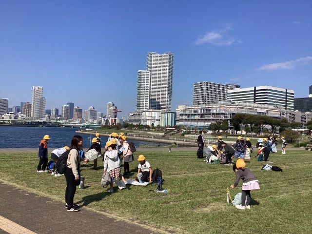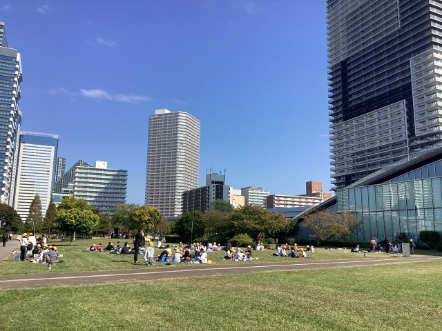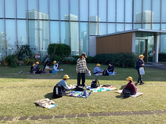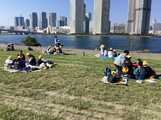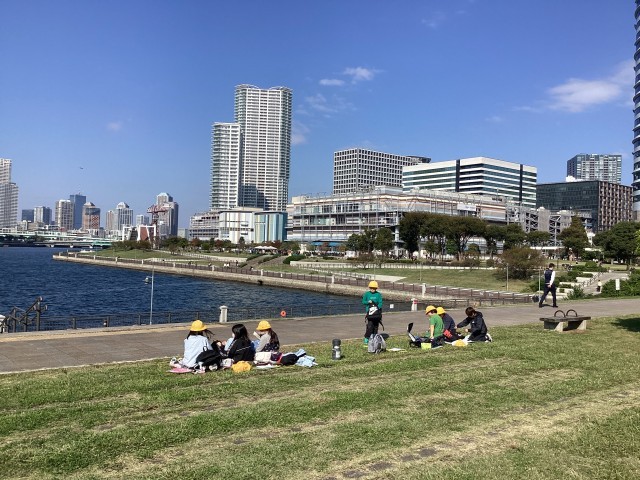 今日は日差しがポカポカと温かったので、芝生広場で運河とタワーマンション群を眺めながらとなりました。