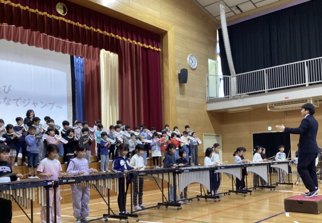 2年生は、音楽科で学習した4曲を、鍵盤ハーモニカ、鉄筋や木琴、小太鼓や大太鼓の音を合わせて演奏しました。
