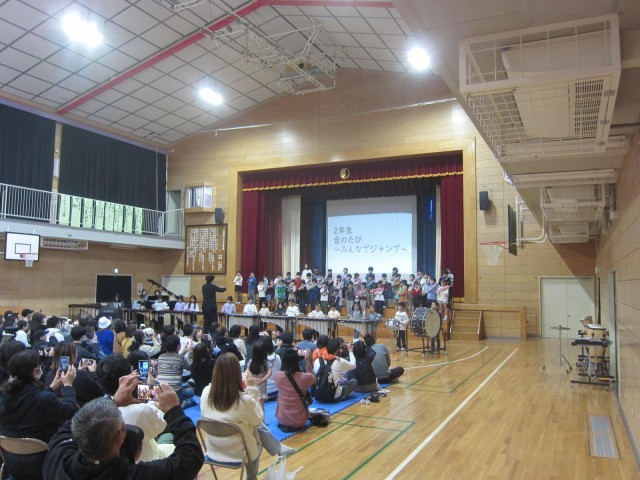 2年生の「音のたび」は、元気いっぱいの演奏や歌声に担任の指揮とピアノ演奏が合わさって、観衆を魅了していました。