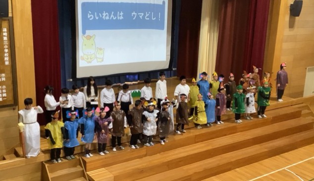 はこべ学級では、日本の十二支の学習をもとに、他国の十二支についての学びを広げ、劇やプレゼンテーションで紹介しました。