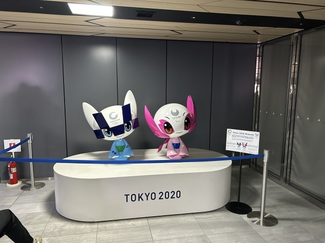 東京オリンピックのマスコット、ミライトワとソメイティに迎えられ、アリーナ内部へ。