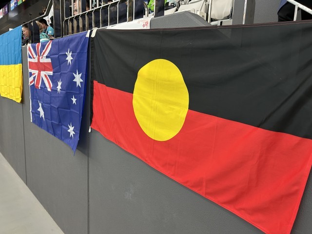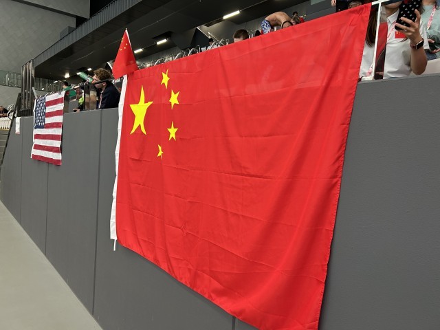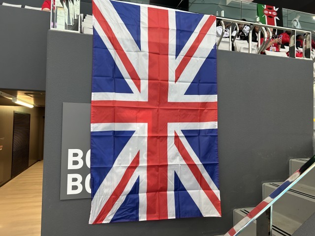 これまた大きなプールの周りに、様々な国の国旗が飾られています。
