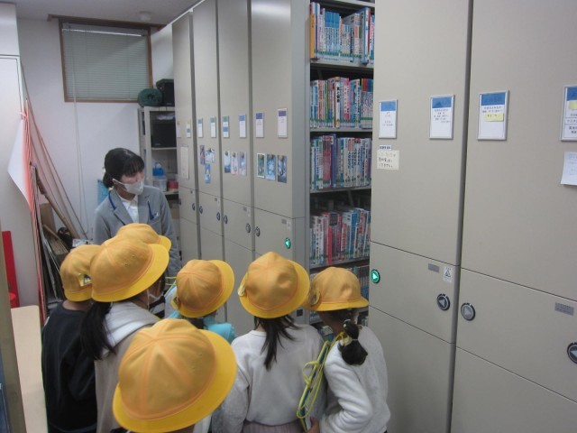 図書館のバックヤードを見学して、大きな本棚が自動で動く様子を見たり、