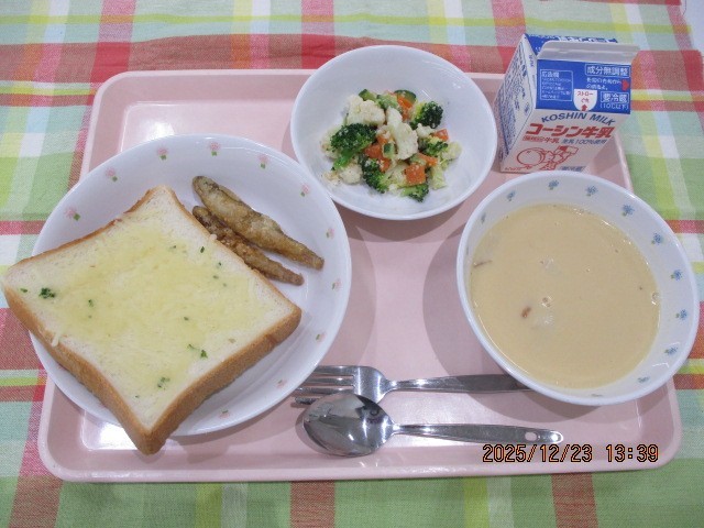 ガーリックチーズトーストは、2-2のリクエストメニューで、カルシウムアップメニューです。チーズやわかさぎ、大豆には、骨や歯のもとになるカルシウムが多く含まれています。