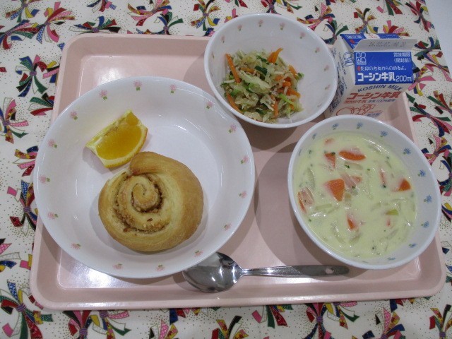 シナモンナッツロールは、学校で作った生地の上に、シナモンシュガーとナッツをのせて、クルクル巻いて作った篠三小の手作りパンです。