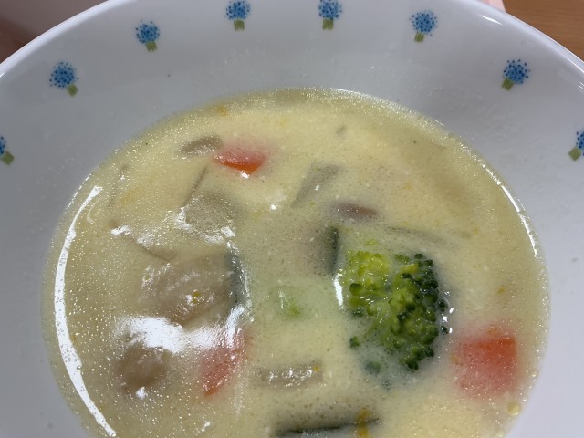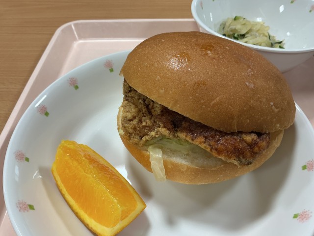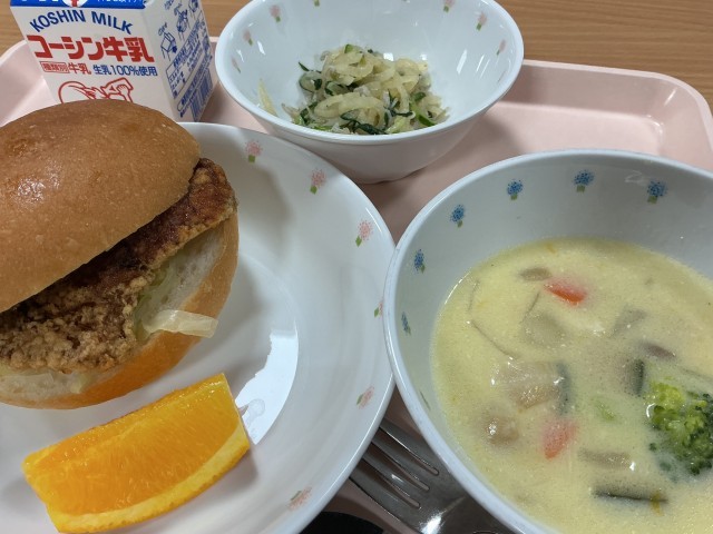 今日の給食は、このフィッシュバーガーに、かぼちゃのチャウダーを添えました。魚介類や野菜、ベーコンなどを牛乳やトマトで煮込んだ具たくさんのスープで、不足しがちな栄養を補給し、フィッシュバーガーにチャウダー、サラダを一緒に食べあわせることで、今日の味が完成するよう調理しています。