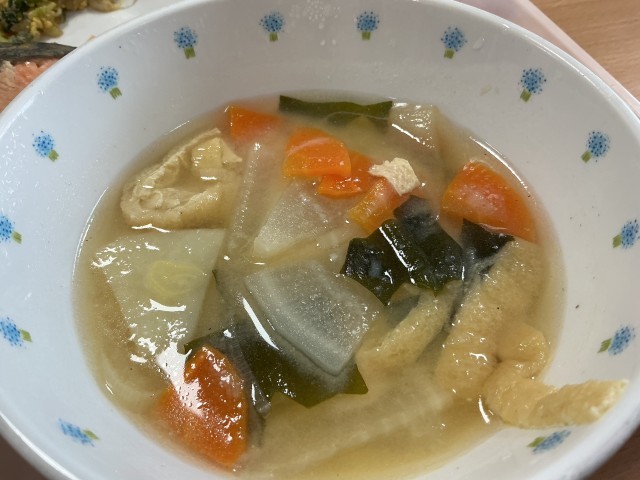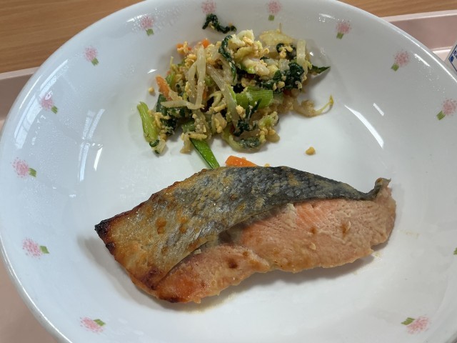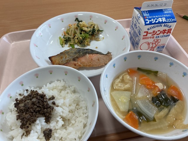 今日のメニューは、「サケの粕付け焼き」に「かわりごま和え」、「ゆかり昆布ふりかけ付きご飯」、「呉汁」と「牛乳」です。酒粕とは、日本酒を絞った後に出る白い固形物です。酒粕には、たんぱく質からつくられるペプチドやビタミンB群、不溶性食物繊維が含まれ、栄養価の高い食品です。ただし、アルコール分が含まれているため、火を入れ、アルコール分を飛ばして使います。今日の調理では、サケの切り身に酒粕をつけ、旨みがより感じされるよう調理しました。これに、具だくさんの呉汁を添えました。大豆をすりつぶしたもの(呉)を味噌汁に入れ、栄養たっぷりの汁物にしました