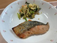 今日のメニューは、「サケの粕付け焼き」に「かわりごま和え」、「ゆかり昆布ふりかけ...