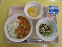 ■献立チキンカレーライス・パプリカ入りサラダ・フルーツ寒天ポンチ・牛乳■ご入学、...