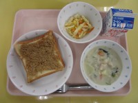 ■献立セサミシュガートースト・いんげん豆のクリームシチュー・マカロニサラダ・牛乳...