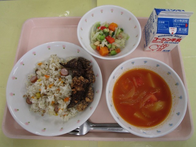 きのこピラフ・レバーのガーリック揚げ・まめ豆サラダ・トマトとじゃがいものスープ・牛乳