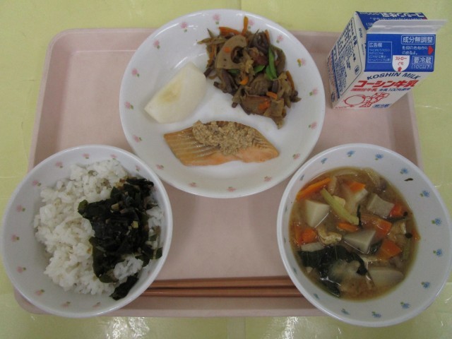 ごはん・わかめの炒め煮・ますのごまマヨネーズ焼き・五目きんぴら・さと芋と油揚げのみそ汁・梨・牛乳