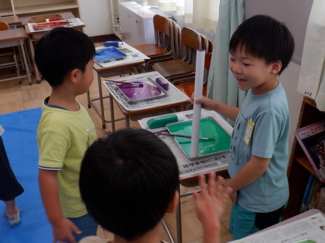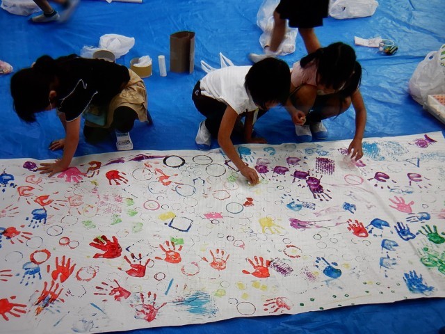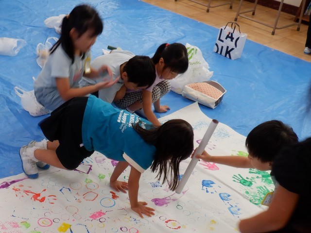 最初は素材の形や模様を試して、思い思いに好きな色でスタンプして遊びました。手に絵の具をつけて、手形を押して楽しむ児童もいました。