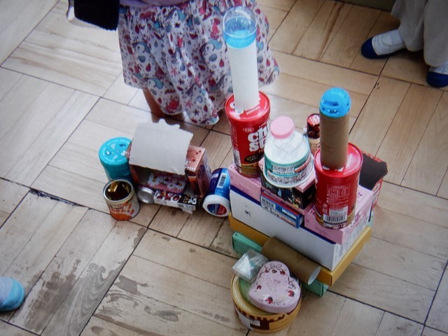 「平べったい箱や、大きな箱を下にすると倒れにくい!」「細長い箱や筒は、少し大きな箱に入れると倒れないよ!」「丸いつつをタイヤにしたら、馬車ができた!」などと、友達同士で工夫してたくさんの発見をしました。
