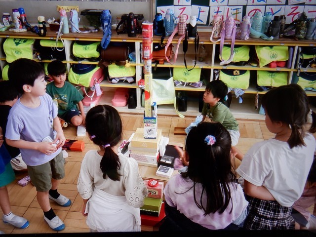算数「かたちあそび」の学習で、箱遊びを行いました。児童たちが家庭から持ち寄った箱や容器、教室にあった段ボールなどを使って、並べたり、高く積み上げたり、町を作ったりして遊びました。