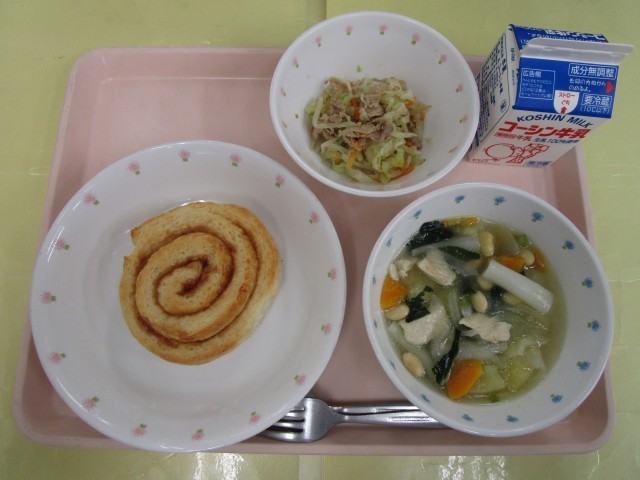 手作りアップルシナモンパン・チキンと米粉マカロニのスープ煮・豚肉と千切り野菜のサラダ・牛乳